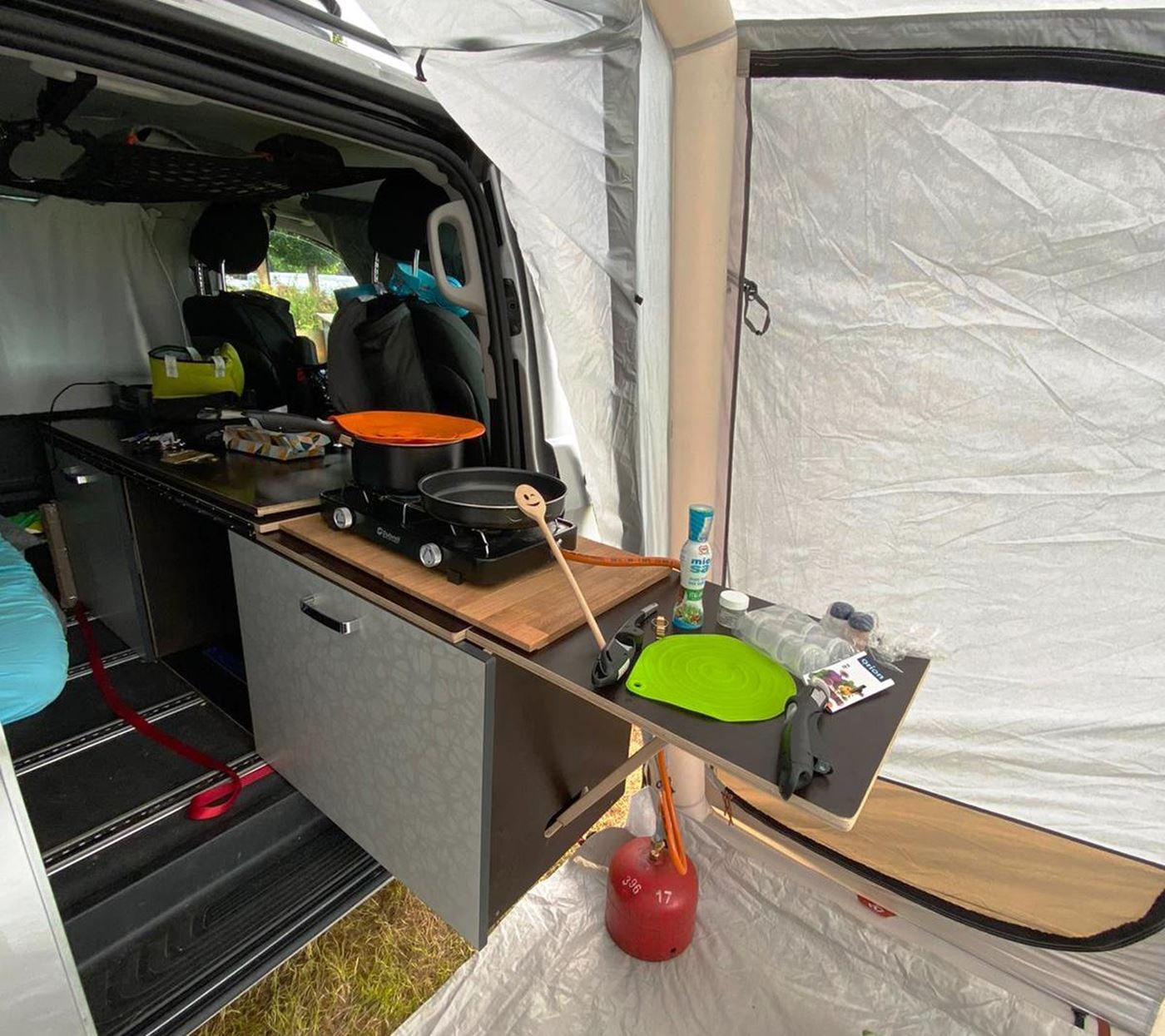 Jsme schopni vyrobit i vestavbu, kterou vložíte mezi sedačky, jako na prvním obrázku níže, který nám zaslal náš spokojený zákazník, přímo z místa ceampu. A která se dá následně i rozložit pro spaní (vozidlo Mercedes)